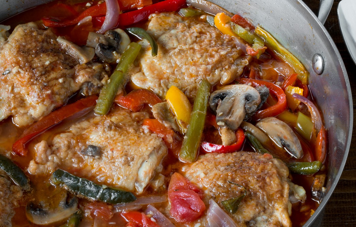 A lot of recipes for chicken cacciatore list only bell peppers but we kick up the flavor of this favorite with several different types of peppers – red and green bells, poblanos, Cubanelles, sweet reds, and sweet yellows. Each adds their subtle difference in flavor to make for a VERY flavorful meal, and if you want, some heat (from the seeds and membranes of the poblanos).