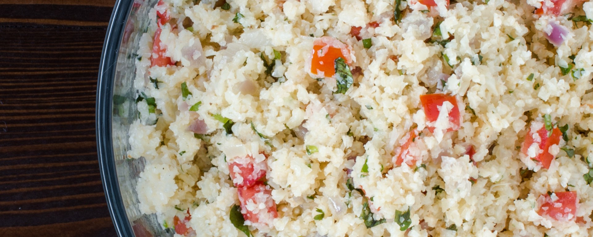 Cauliflower “couscous” or “rice” is a great side dish and an excellent base for a healthy bowl.