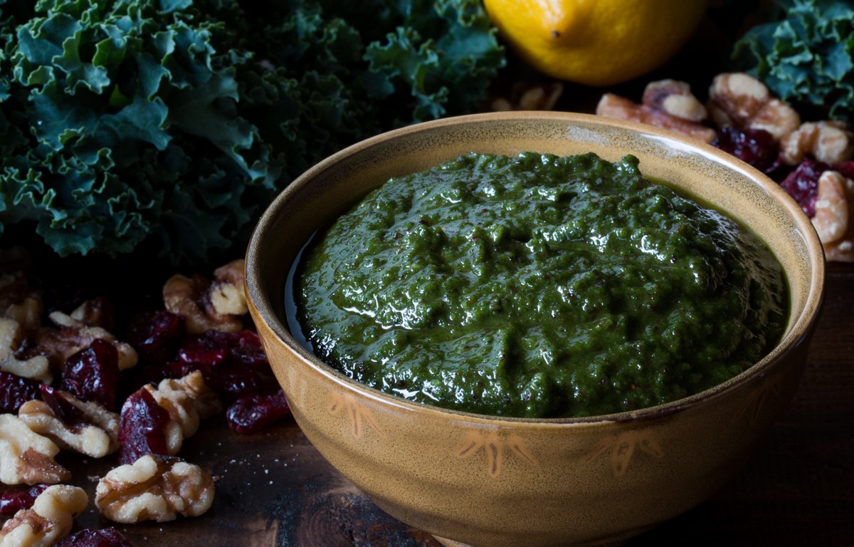 If you eat lots of fresh vegetables, then your fridge often gets full and finding space can be a challenge. Kale is a great vegetable, and we love to eat it lots of different ways. But it is fluffy and can be a fridge space hog, and sometimes, we just need to make room for the celery and kohlrabi. This pesto recipe is delicious, and it reduces kale’s refrigerator real estate demands. It is versatile like basil pesto, but more mild in flavor. Use it with pasta, salads, vinaigrettes, or with roasted or grilled meats.