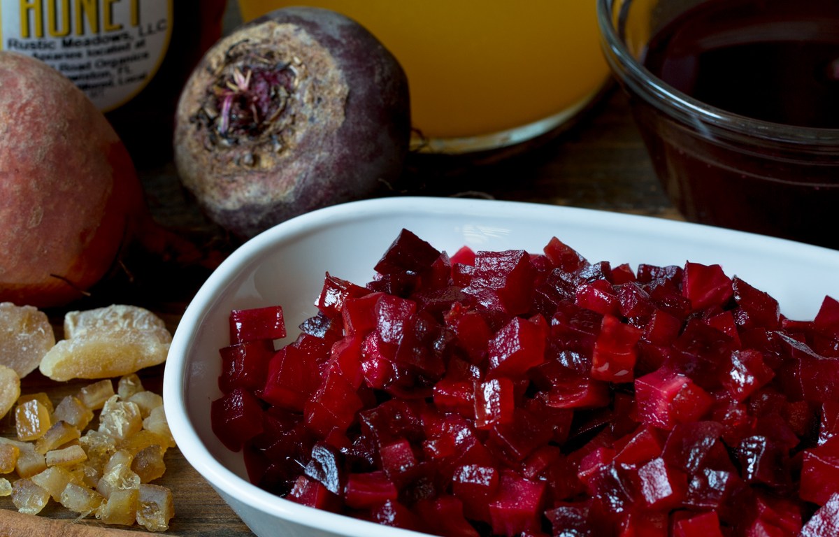 - Add the sour orange juice and honey to a medium saucepot on medium-high heat, stir to mix well, bring to a boil, add the diced beets, cinnamon stick, candied ginger and orange peel, stir, reduce to a simmer, stir occasionally, cook for 15 minutes.
