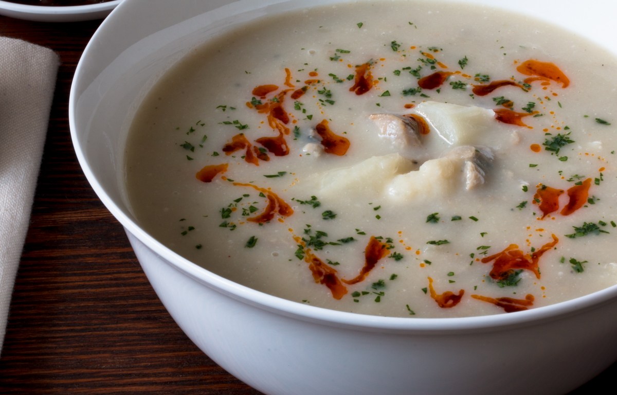 Cauliflower isn’t only for roasting or crudité platters; it’s also great for soups: chunky, rustic soups, or creamy, more refined soups. This soup is a little of both, and made in the style of a New England clam chowder but that is where the similarity ends. We replaced the potatoes and cream, yes cream, with our cauliflower, so as much as we like a classic New England clam chowder we LOVE this version with no dairy or flour.
