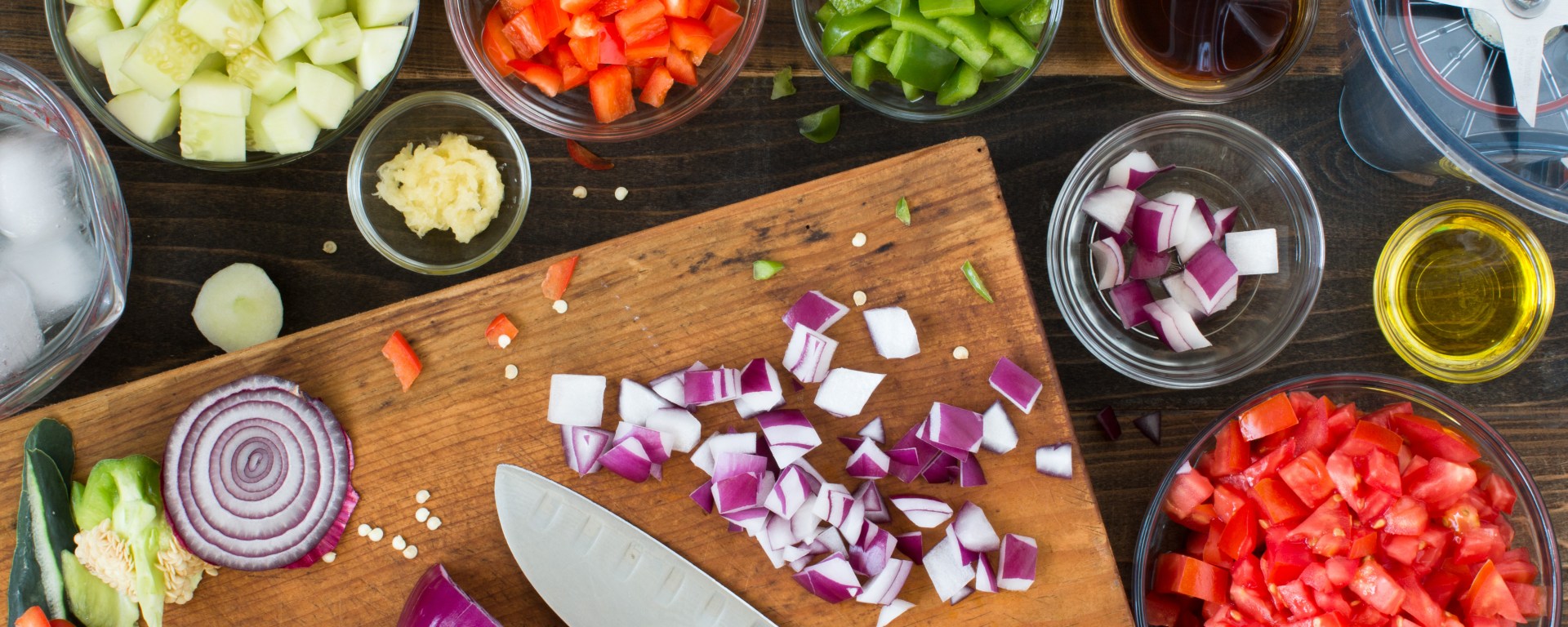 - Wash and dice the tomatoes, cucumber, and bell peppers; set aside.