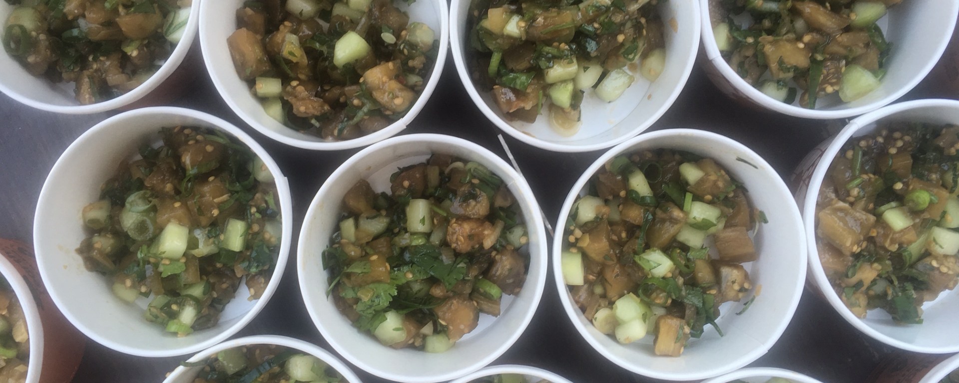 The roasted and sautéed eggplant in this recipe has a satisfying texture, and the flavors are zingy and mouth-awakening. Many thanks to Chef Jason Osborne and the CTC Student Chefs for creating and preparing this wonderful recipe for this week’s demo sample at Worden Farm!