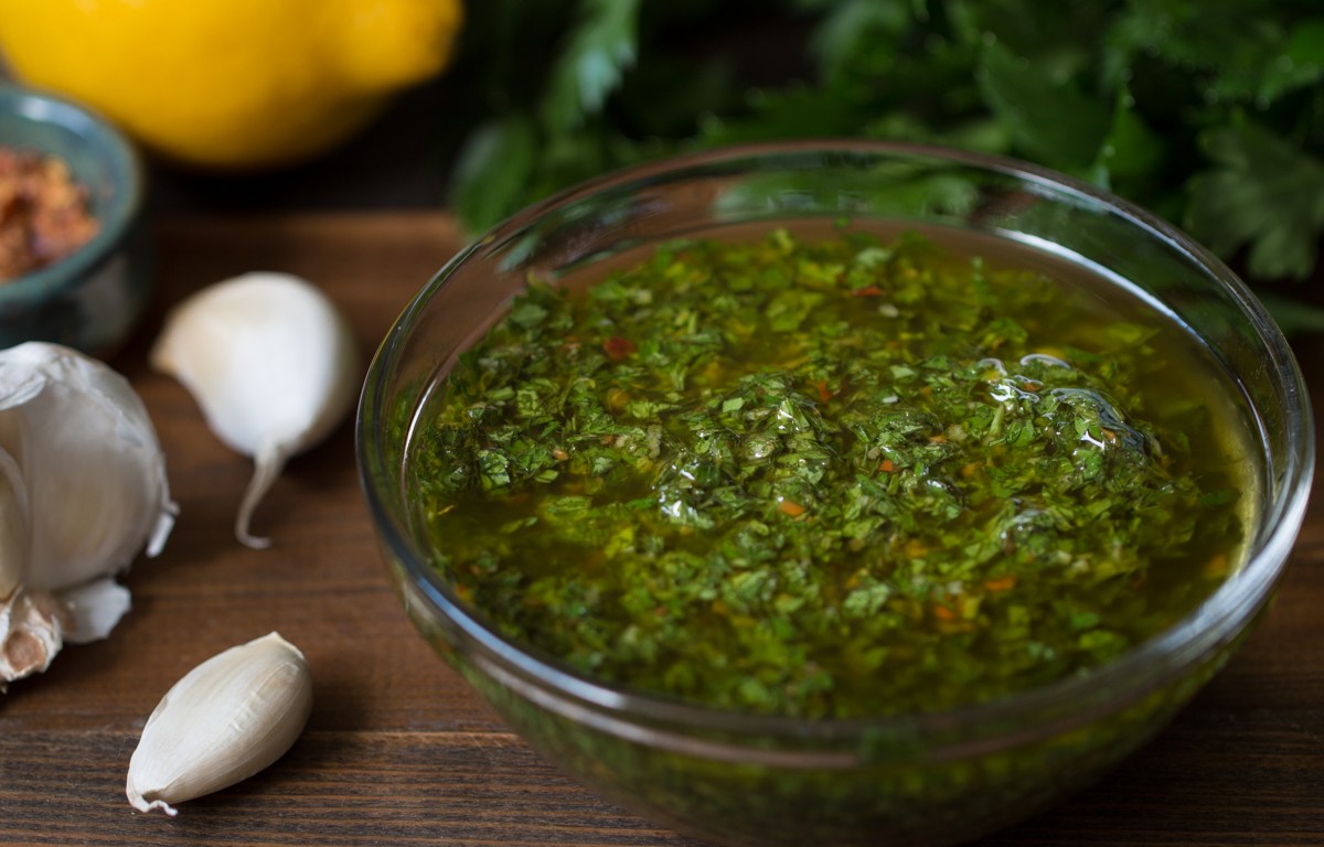 - Traditional parsley chimichurri with parsley, garlic, red pepper flakes, extra virgin olive oil, kosher salt, black pepper, and lemon zest.