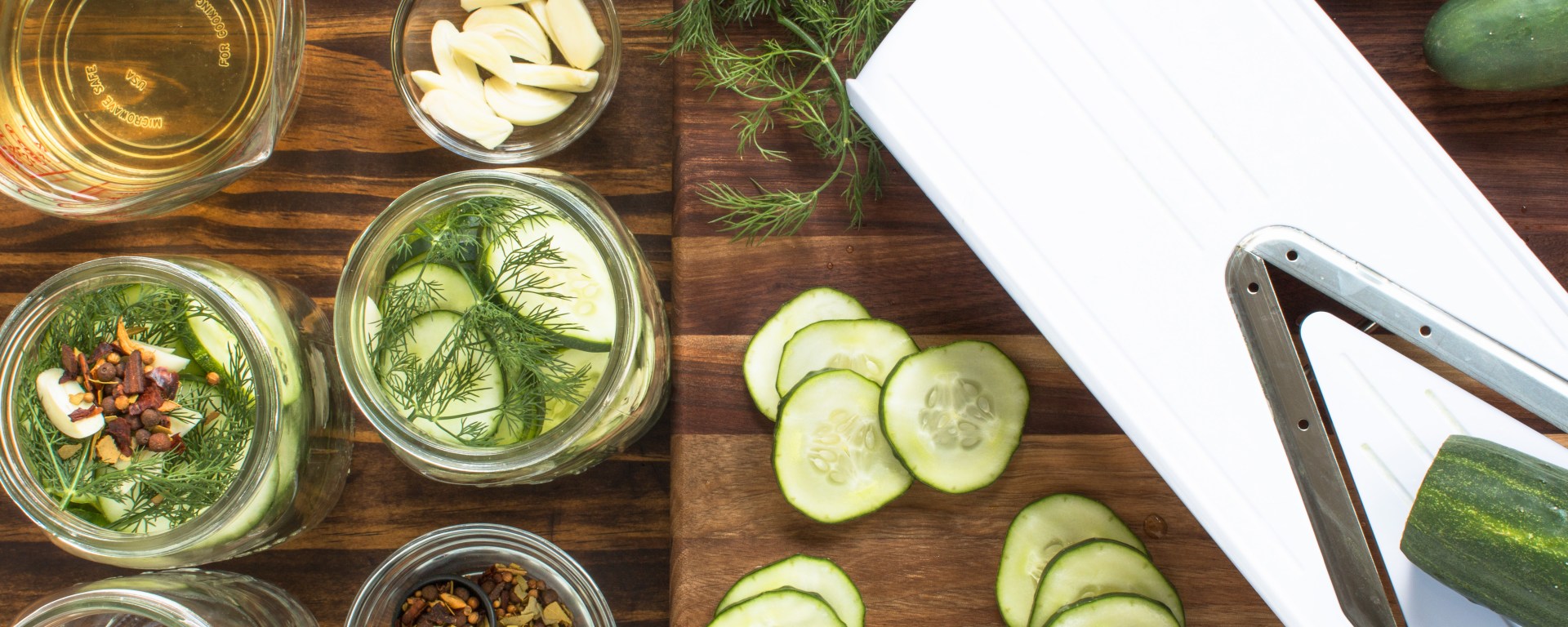 - Wash and trim off the ends of each cucumber, slice into 1/4 inch thick slices, preferably with a mandolin (see photo above); set aside.