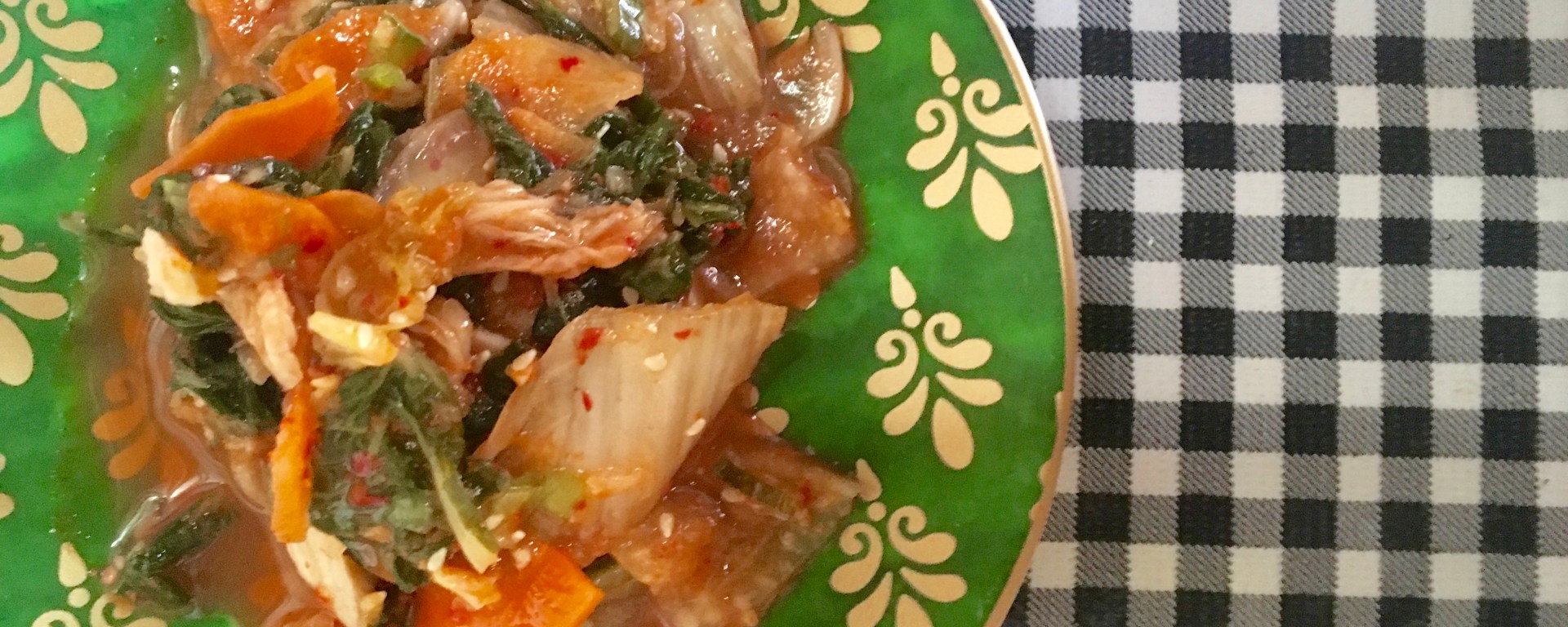 - In a bowl, mix cabbage, bok choy, kohlrabi, garlic, ginger, spring onions, chilies, pear-onion blend, fish sauce, sugar and white sesame seeds.