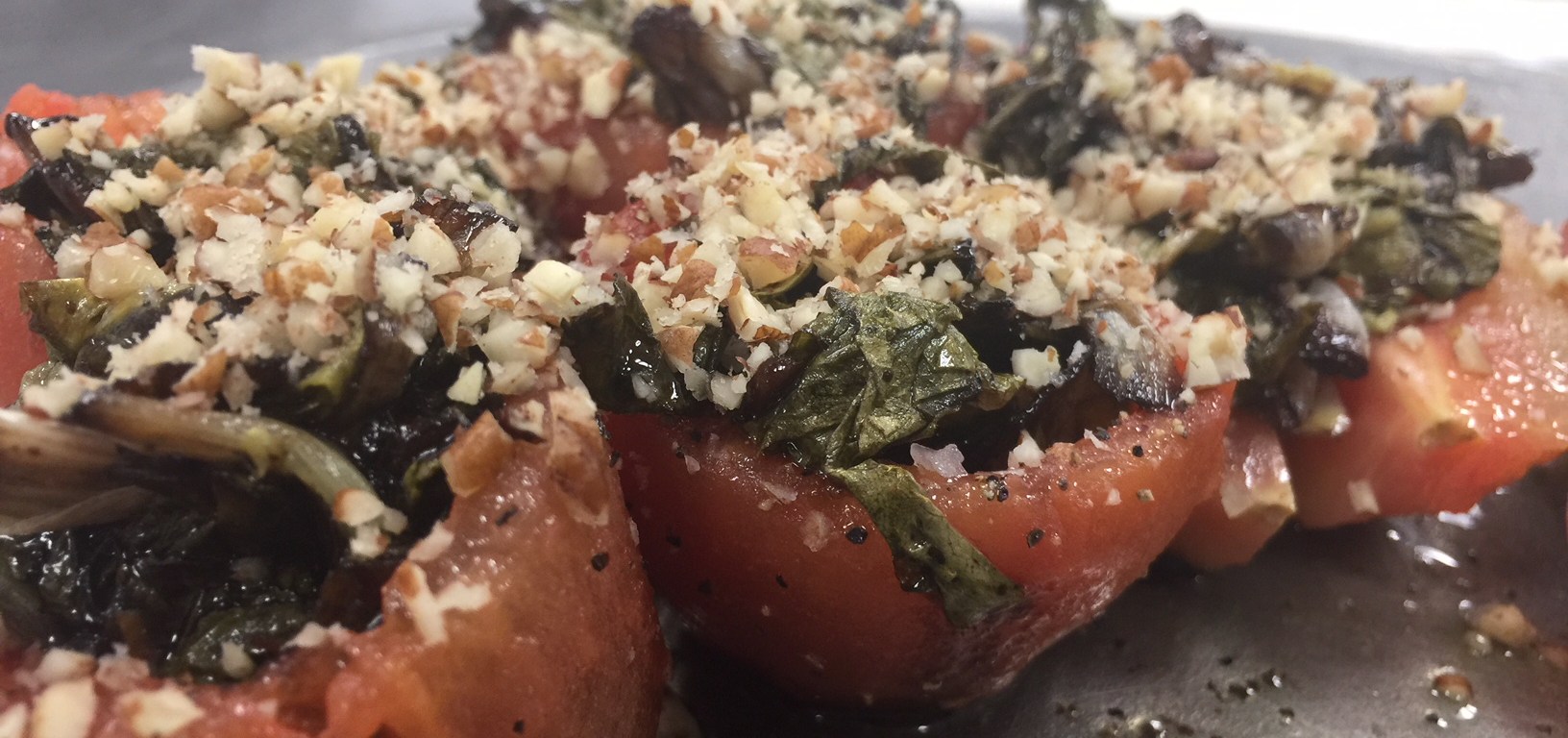 - Fill sous vide tomato cups with sautéed greens, top with pecans